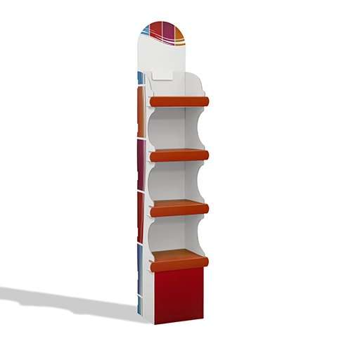 Maska espositore da terra a ripiani Ideale per spazi contenuti Opzione inserimento logo Realizzato con cartone onda EB 4,5 mm Portata 4 kg per ripiano Sono disponibili maggiori dettagli in fondo alla pagina